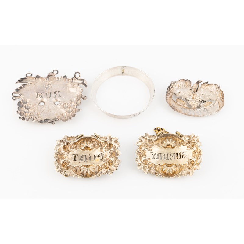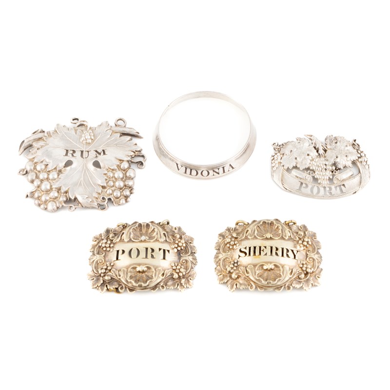 comprising: one by Rawlings & Summers, London 1835, pierced 'Rum', a pair of unmarked gilded labels, pierced 'Port' and 'Sherry', an unmarked label pierced 'Port', and an unmarked ring neck label incised 'Vidonia', approx. weighable 0.8oz. (5)