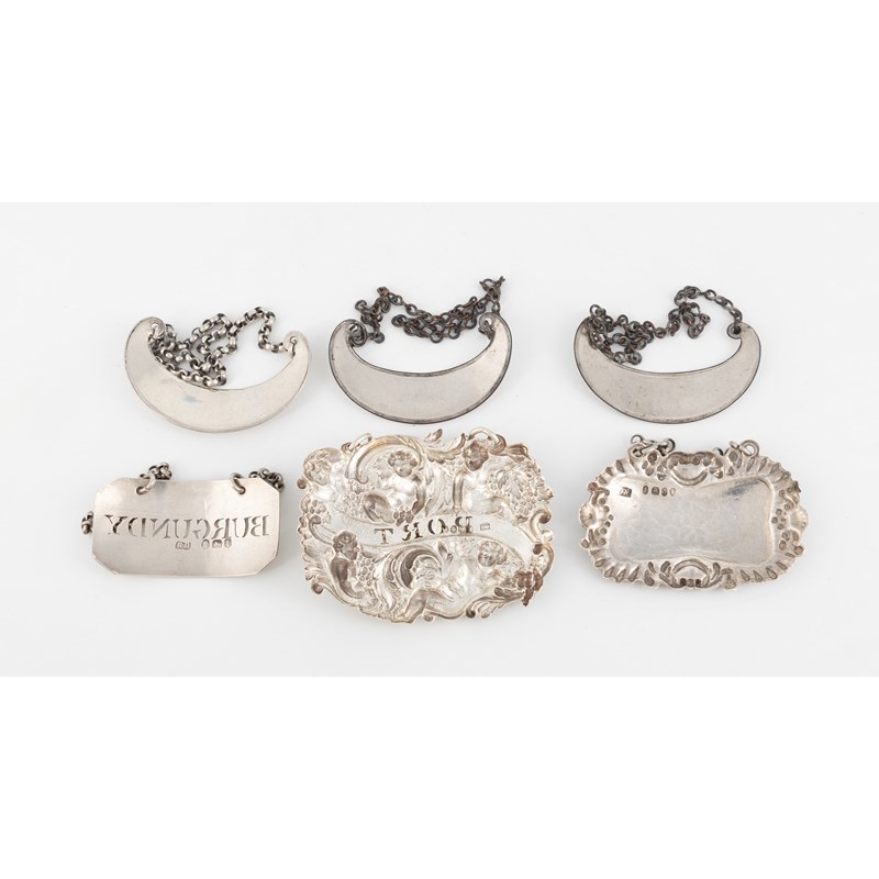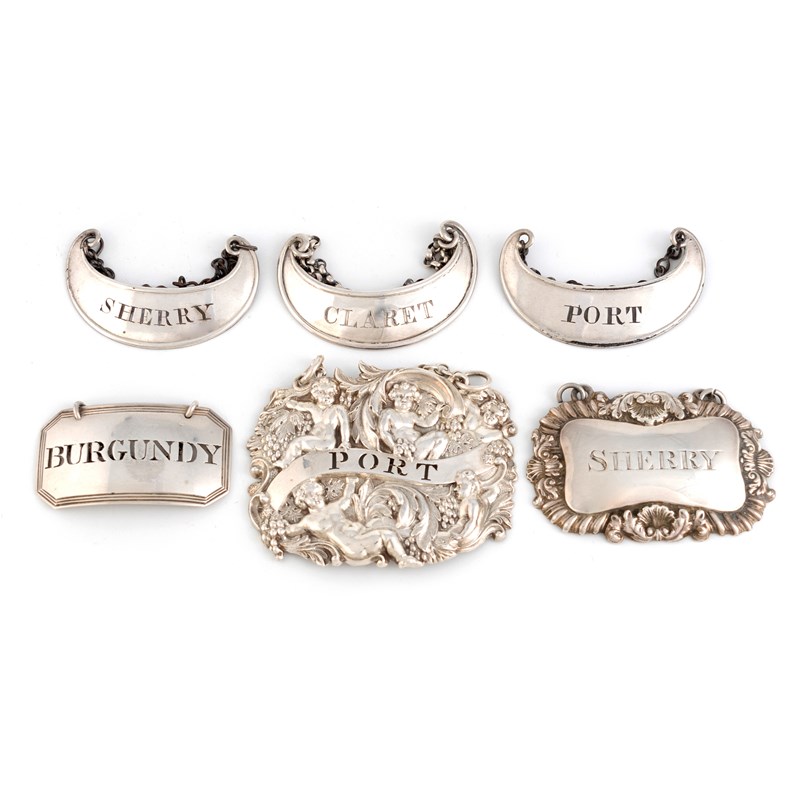 comprising: one by Sampson Mordan, London 1840, rectangular shaped form, with Bacchanalian cherubs and vine and grape decoration, pierced 'Port', one by Robert Barker, London 1794, pierced 'Burgundy', one with maker's mark ?K/H, London 1829, incised 'Sherry', and a set of three unmarked labels, incised 'Claret', 'Sherry' and 'Port', length 5.1cm, total approx. weighable 1.7oz. (6)