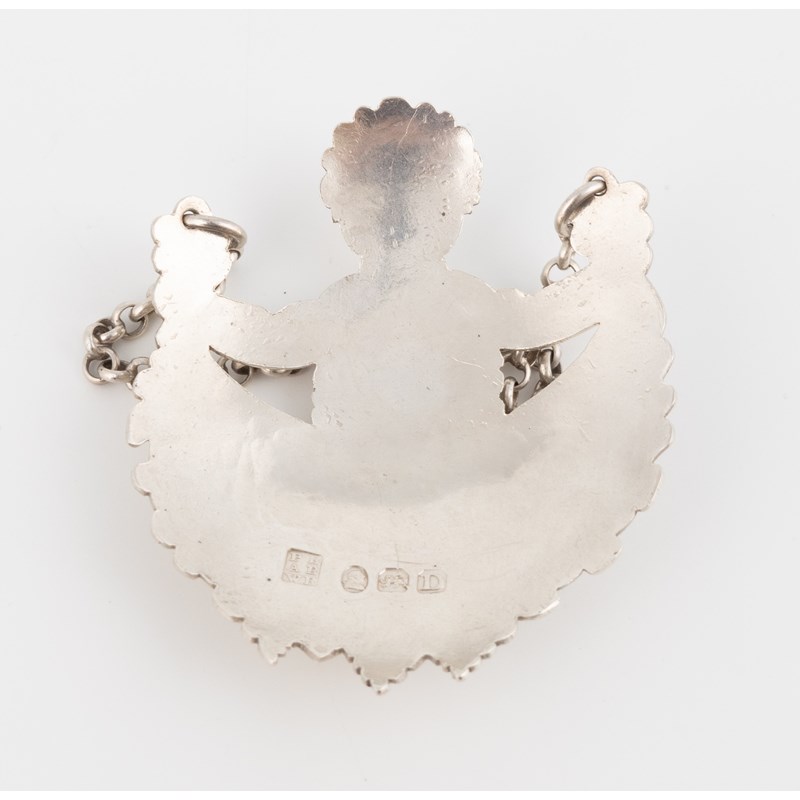 modelled as a Bacchanalian Cherub with outstretched arms holding a banner, vine border, incised 'Madeira', height 5.6cm, approx. weight 0.5oz.