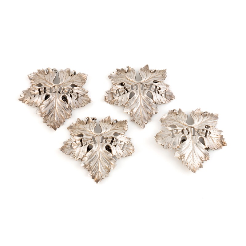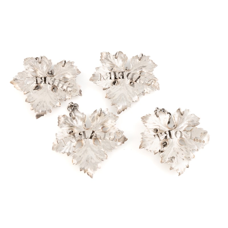 vine leaf form with engraved decoration, pierced 'Port', 'Claret', 'Madeira' and 'Sherry', length 6.4cm, total approx. weight 3.3oz. (4)