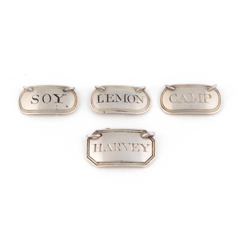 oblong form with reeded border, incised 'Soy', 'Lemon' and 'Camp', plus a George IV Irish silver sauce label by Henry Flavelle, Dublin circa 1825, retailed by Law, incised 'Harvey', length 2.8cm, total approx. weight 0.3oz. (4)