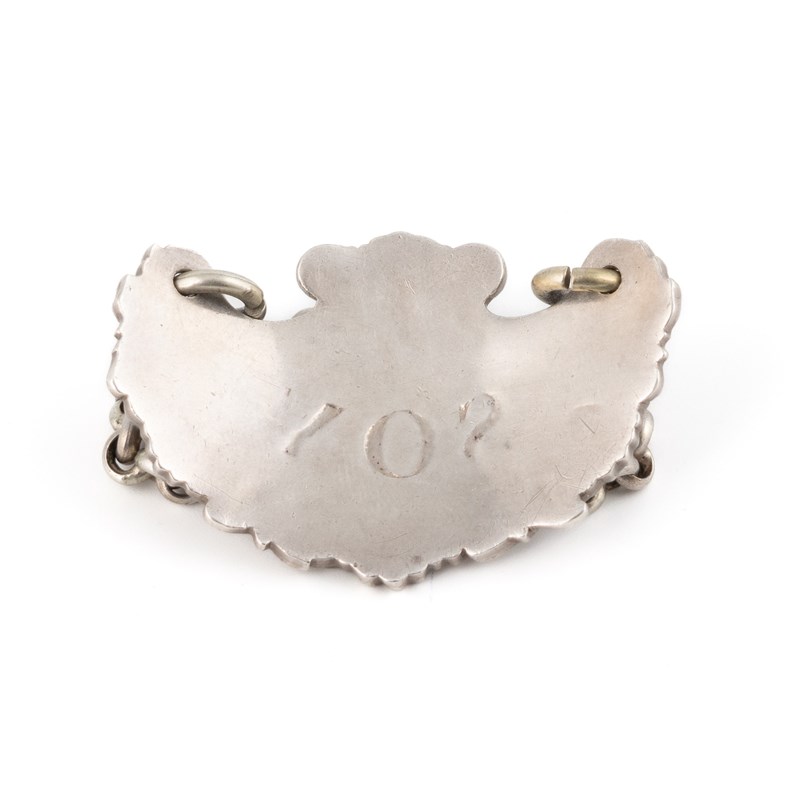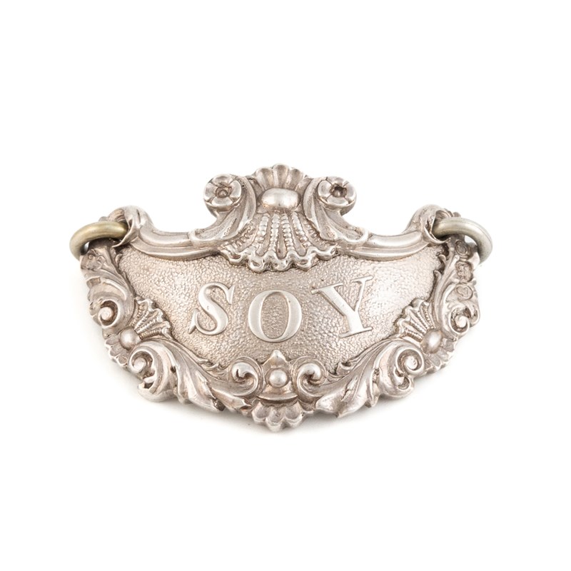 oval shaped form with a shell and scroll border, embossed 'Soy' on a matted background, length 3.8cm, approx. weight 0.5oz.