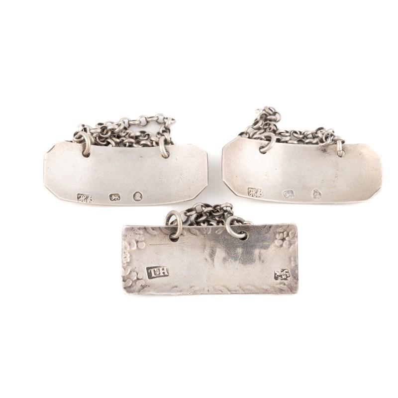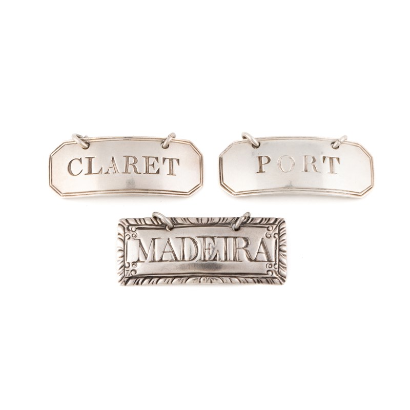 rectangular form with canted corners and reeded borders, incised 'Claret' and 'Port', length 4.3cm, plus a George III silver wine label possibly Thomas Hyde, London circa 1780, incised 'Madeira', total approx. weight 0.8oz. (3)