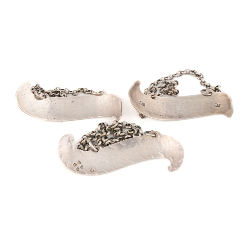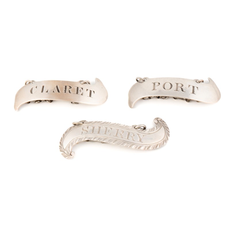plain scroll form, incised 'Port', length 5.4cm, plus an unmarked label of similar form incised 'Claret', and a label by Reily & Storer, London 1845, incised 'Sherry', total approx. weight 0.8oz. (3)