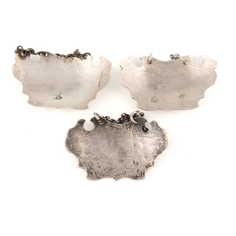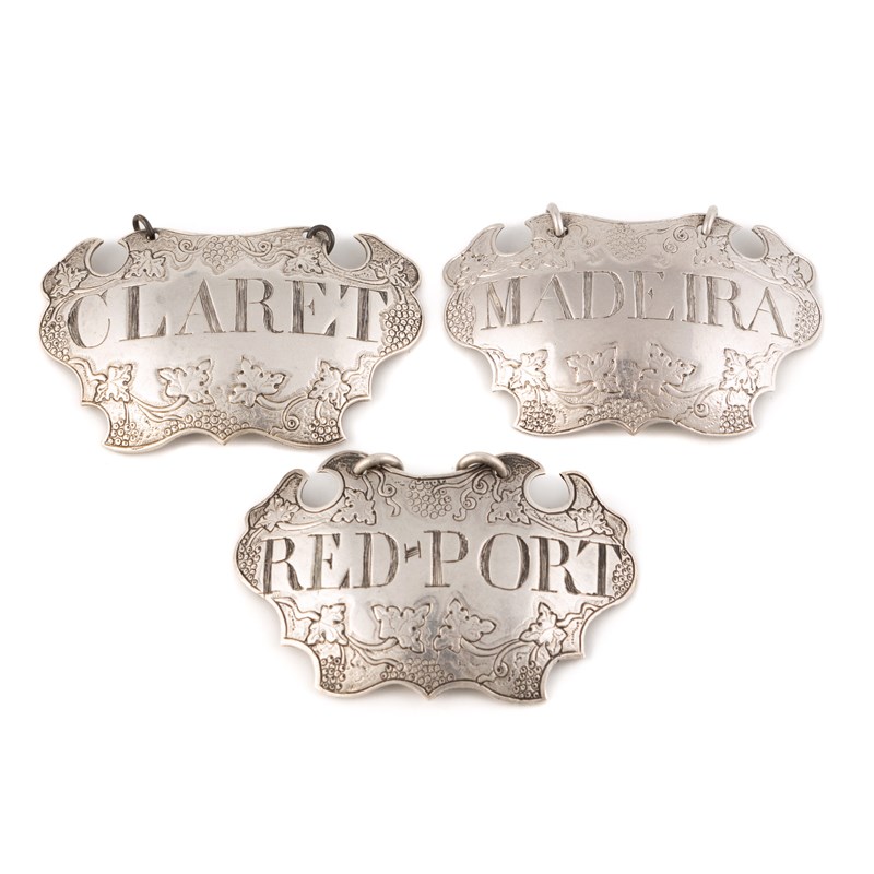 escutcheon form, with grape and vine decoration, incised 'Madeira' and 'Claret', length 5.4cm, plus a label by Edmund Medleycott, London circa 1750, incised 'Red.Port', total approx. weight 1.3oz. (3)