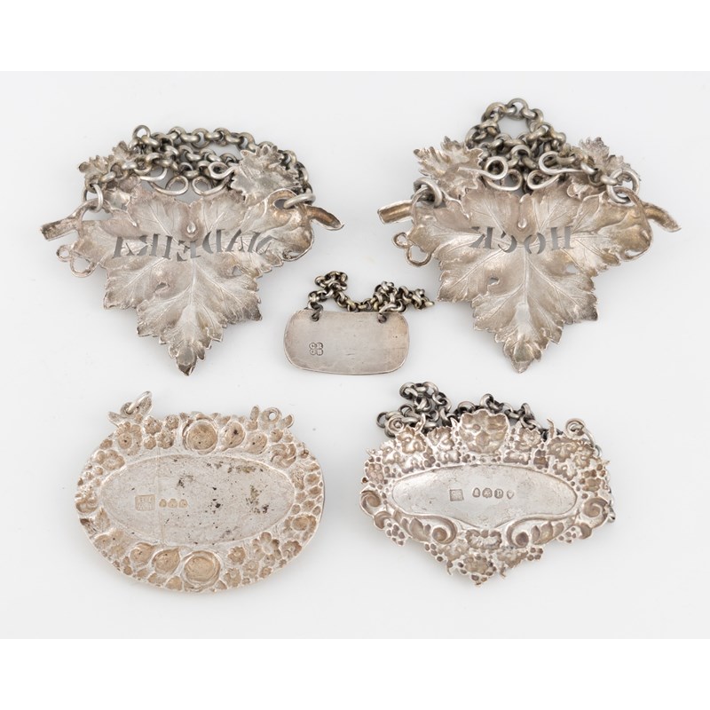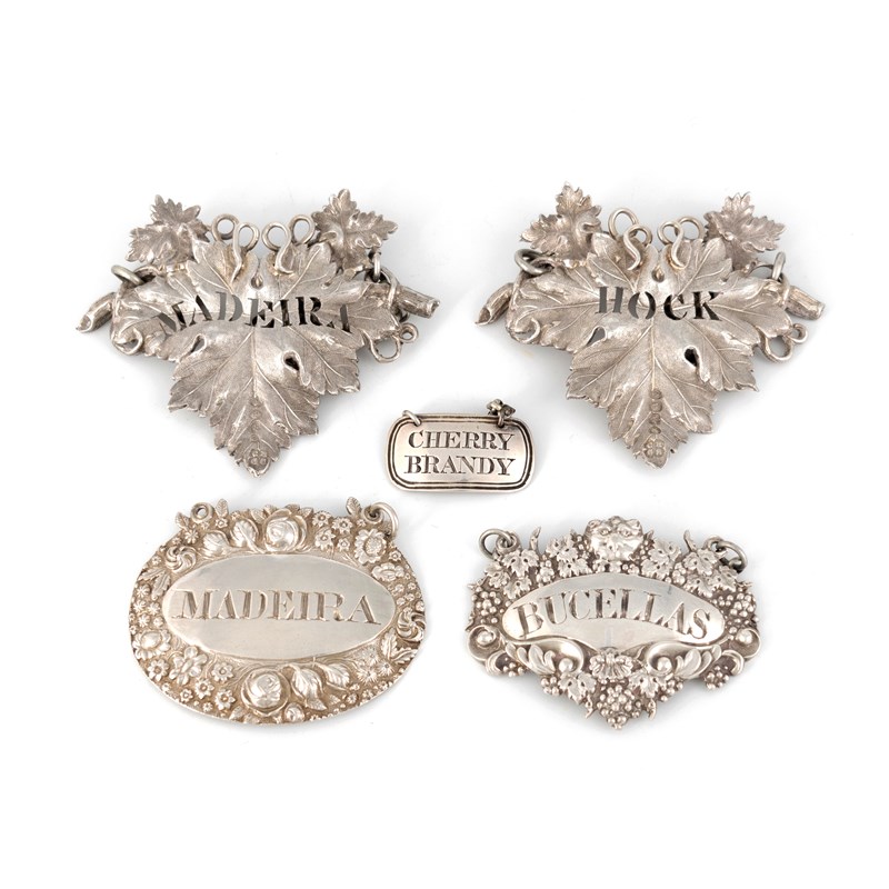 comprising: a pair by Charles Reily & George Storer, London 1837, vine leaf form, pierced 'Hock' and 'Madeira', length 7cm, one by Charles Rawlings & William Summers, London 1830, incised 'Bucellas', one by Thomas Wallis & Jonathan Hayne, London 1818, incised 'Madeira', and one by Charles Reily & George Storer, London circa 1830, incised 'Cherry Brandy', total approx. weight 2.8oz. (5)