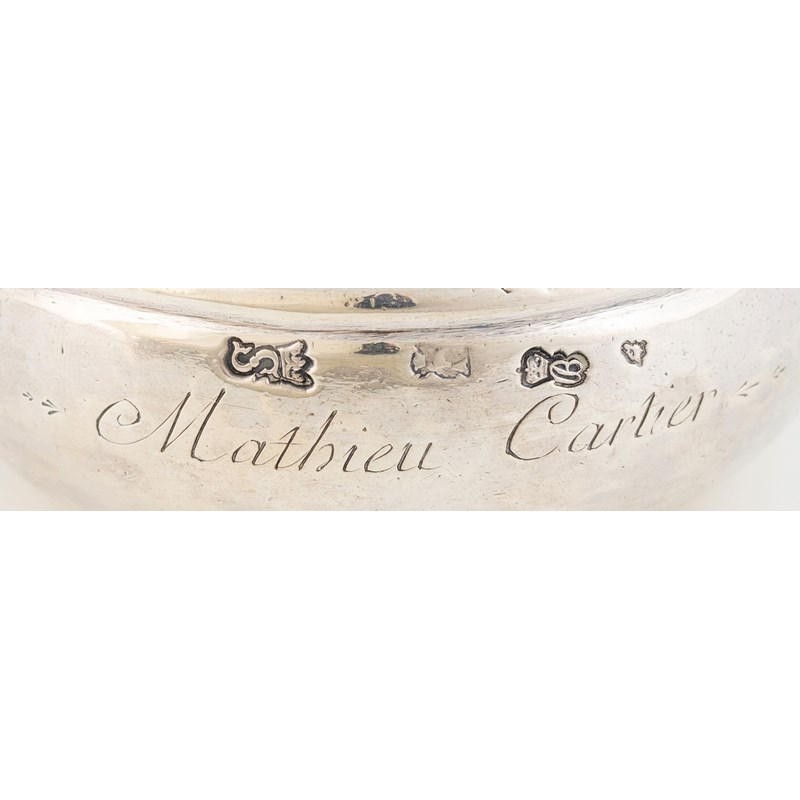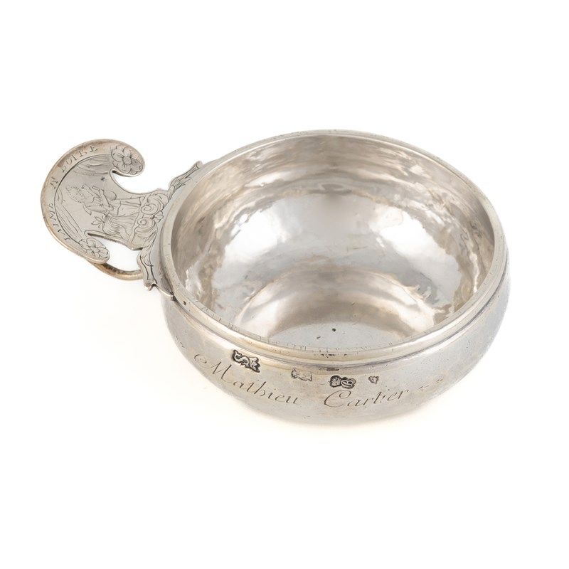 circular form, the shaped scroll thumb-piece engraved with a seated woman drinking wine, also inscribed 'I aime de Boire', with a finger ring, the side inscribed 'Mathieu Cartier', length 11.5cm, approx. weight 4.4oz.