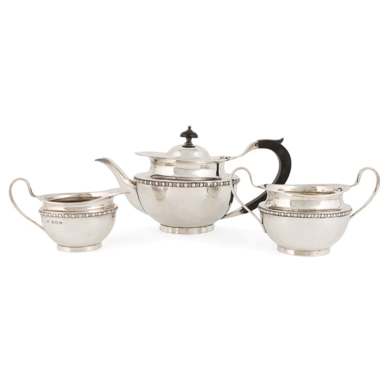 tapering circular form with a moulded border, length handle to spout 25.2cm, total approx. weight 26.3oz. (3)