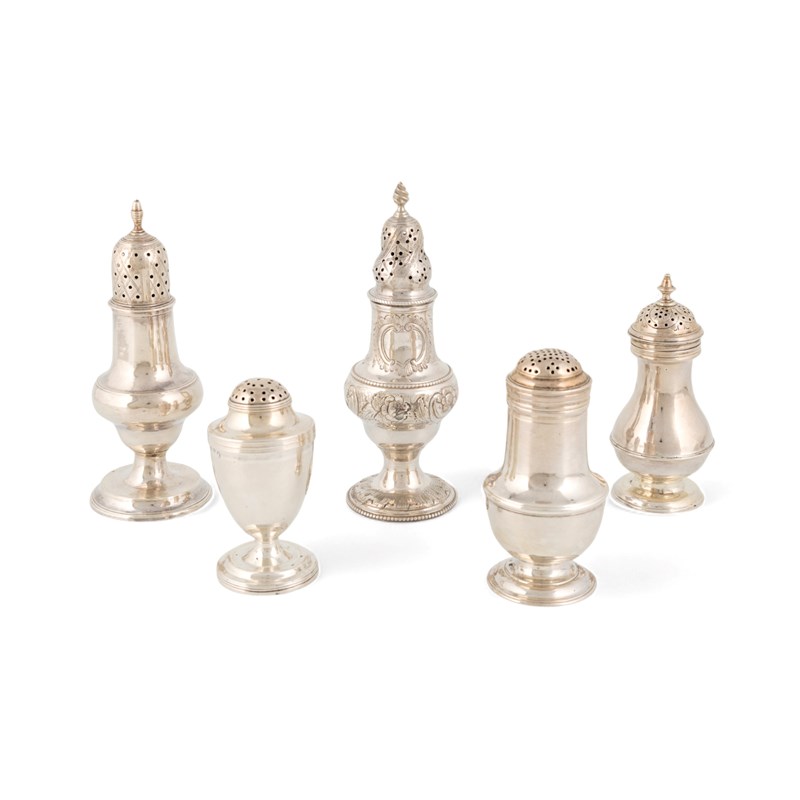 comprising: one by Thomas Daniell, London circa 1780, with later embossed decoration, one by Samuel Wood, London 1747, one with no apparent maker's mark, London 1756, one possibly by Solomon Hougham, London 1793, and one with a worn maker's mark W?, London 1799, total approx. weight 12.3oz. (5)