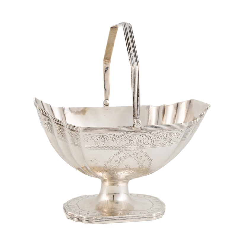 tapering rectangular form with fluted canted corners, engraved foliate border and an engraved crest and initials to the cartouche, reeded border and swing-handle, on a raised rectangular shaped foot, length 14.5cm, approx. weight 6.9oz.