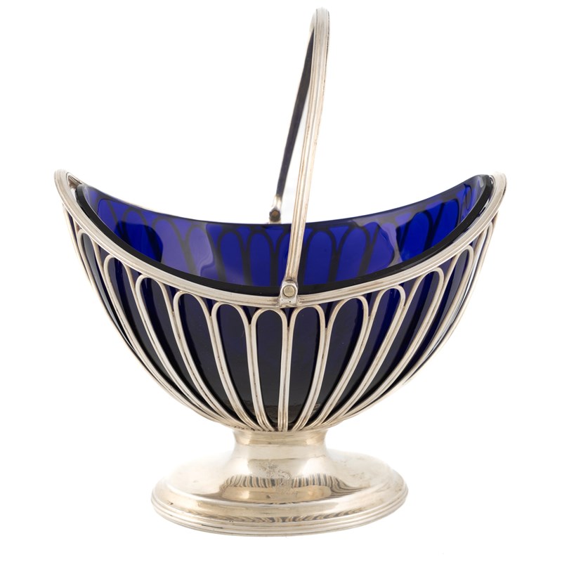 oval wirework form, reeded swing-handle and borders, with a blue glass liner, length 15.2cm, approx. weight 8.3oz.