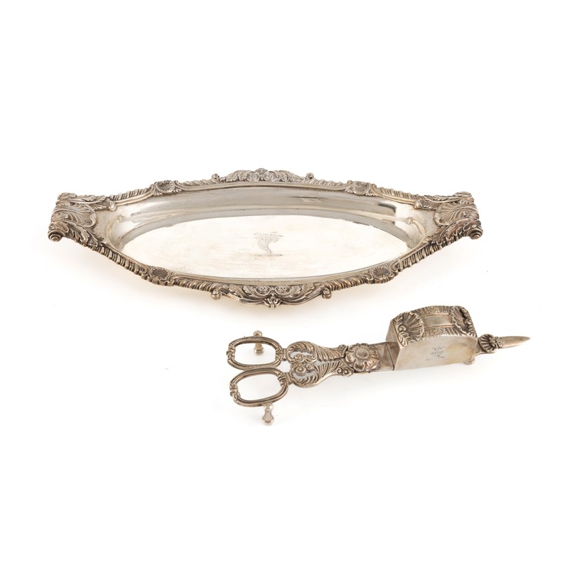 scissor form with shell and scroll decoration and engraved crest, the tray with worn maker's marks, possibly by Paul Storr, London 1810, oval form with a gadrooned, scroll and shell border and engraved crest, length 27.4cm, total approx. weight 16.6oz. (2)