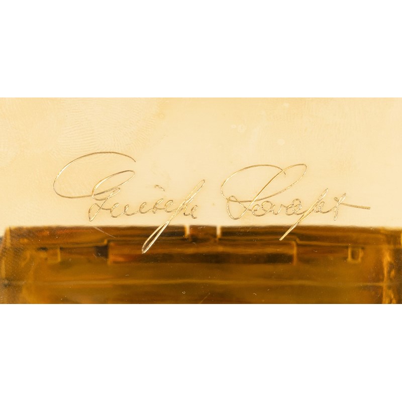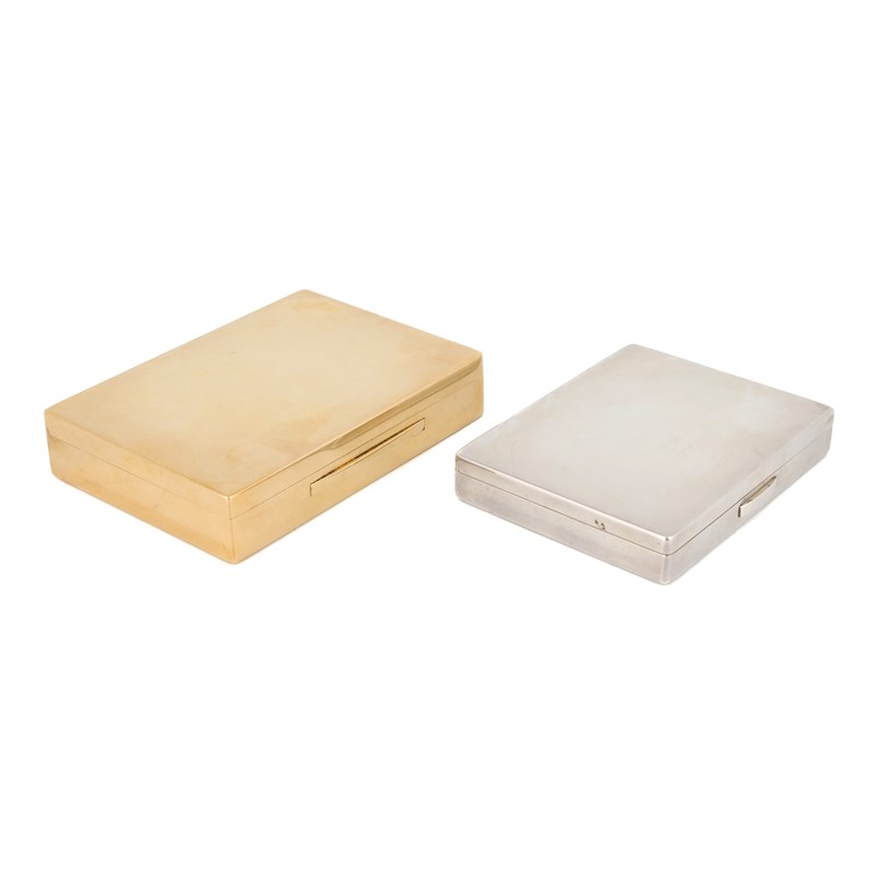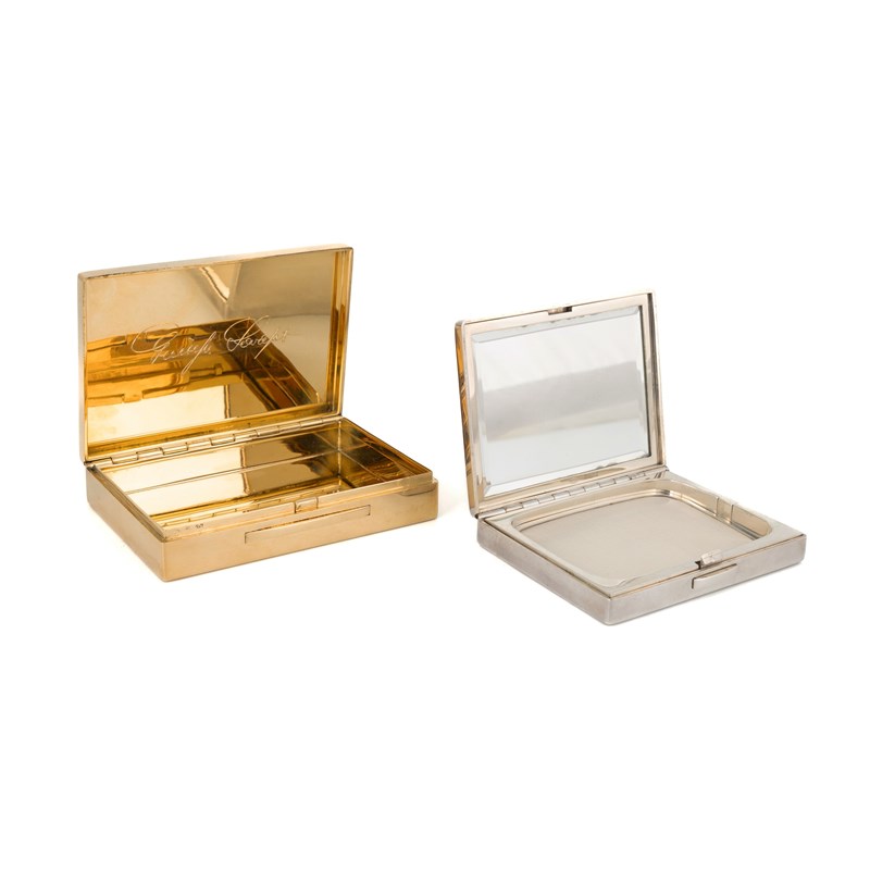 rectangular form, the interior of the hinged cover with a facsimile signature, the interior of the compact with a mirror and powder holder, both in fitted green Bulgari boxes, lengths 8.9cm and 7.5cm, approx. weight of gold 175g., approx. weight of silver 3oz. (2)
