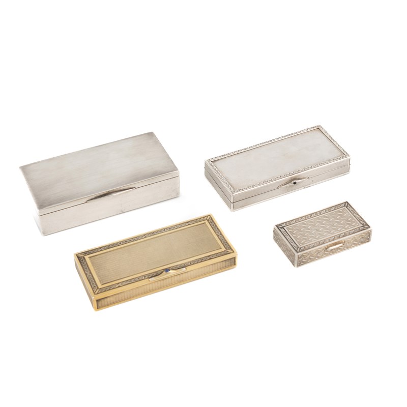 rectangular form with engine-turned decoration, a silver-gilt one with importer's marks of Louis Dessoutter, London 1905, another one with the importer's marks of Louis Dessoutter, London 1907, with an engraved border edge, and one with worn marks, of plain rectangular form, length 8.3cm, total approx. weight 9.9oz. (4)