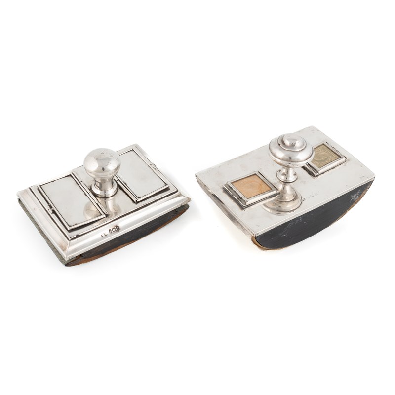 rectangular form with two hinged stamp compartments, plus an Edwardian silver-mounted desk blotter by W J Myatt & Co, Birmingham 1905, with two hinged stamp compartments, length 10.8cm. (2)