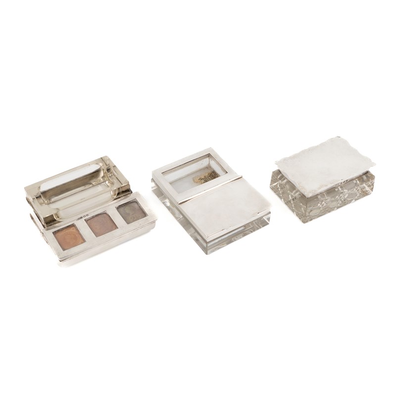 rectangular form, plain cut glass inkwell with silver mounts attached to a stamp box, the hinged cover with three windowed compartments, length 8.6cm, plus a similar stamp box and inkwell by Henry Clifford Davis, Birmingham 1913, and a silver-mounted glass stamp box by Herbert Bushell, Birmingham 1908. (3)