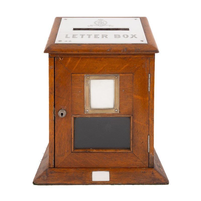 rectangular form, the mount inscribed 'Letter Box' and engraved with 3rd Battalion, The South Wales Borderer's crest and motto, the front with a hinged door and mounted panel and glass window, height 35.7cm.