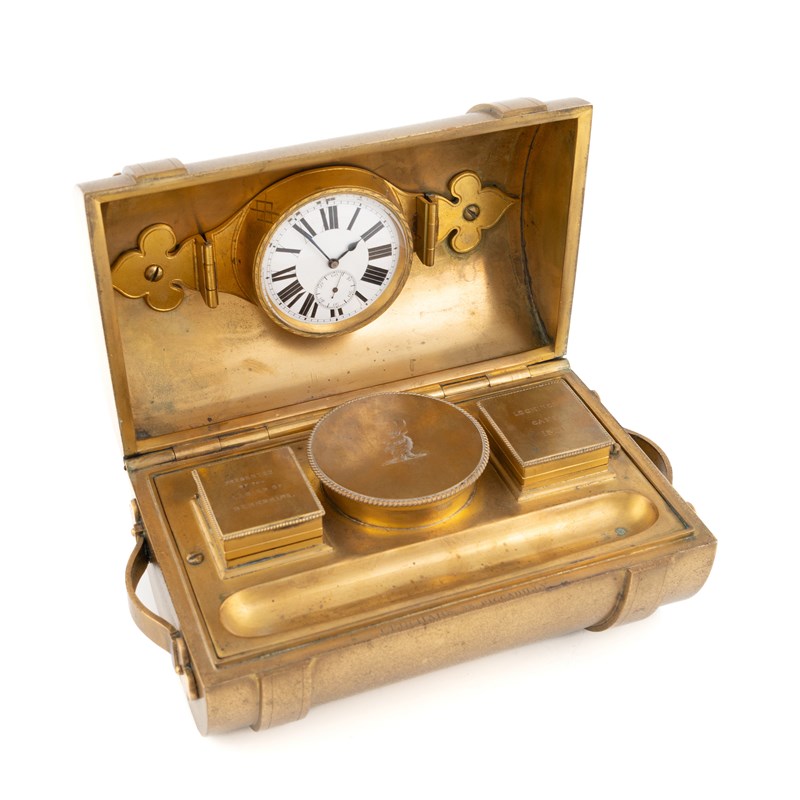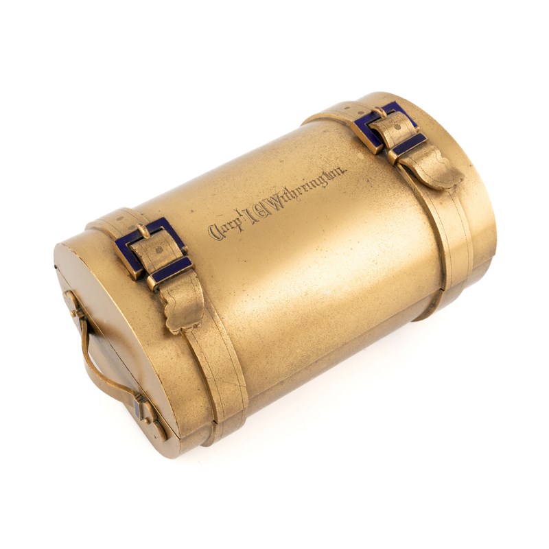 in the form of a cylindrical trunk with blue buckles, the cover inscribed 'Corp: I E Witherington', to the underside of the cover a white enamelled dial watch, to the interior a pen tray, an inkwell, stamp and match compartment, engraved crest and inscription to the covers 'Presented by the Ladies of Berkshire' and 'Lockinge Camp 1864', length 17cm.