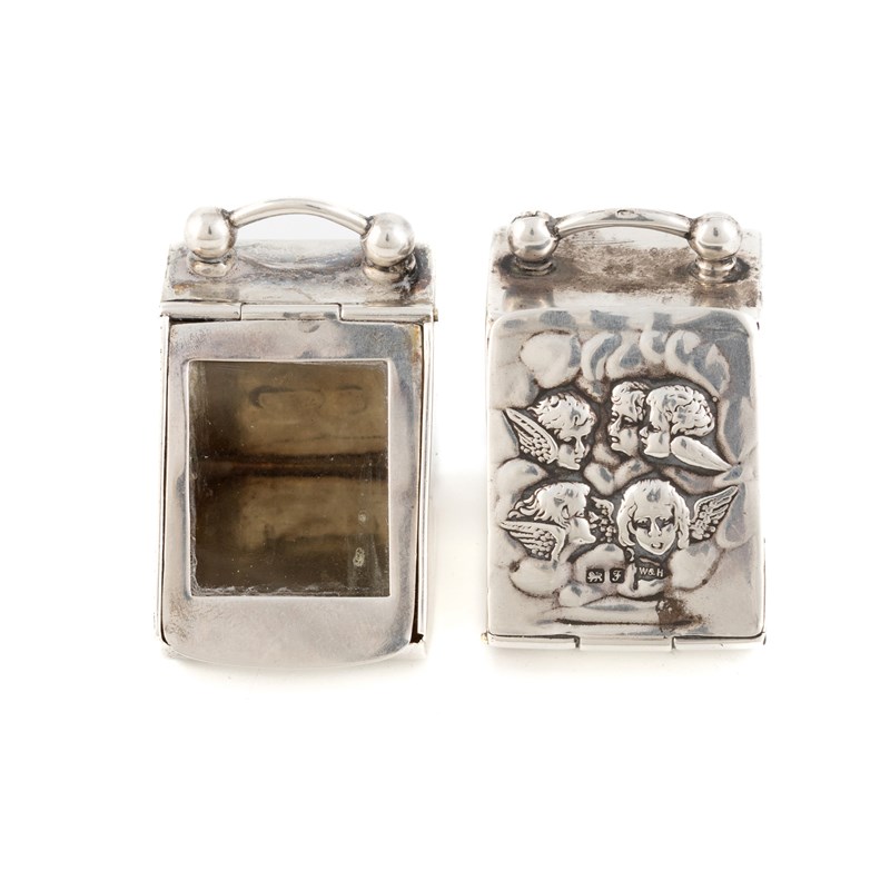 coal scuttle form, embossed cherub heads to the hinged cover, plus one of a similar form by James Deakin & Sons, Chester 1903, length 3.5cm, total approx. weight 0.9oz. (2)