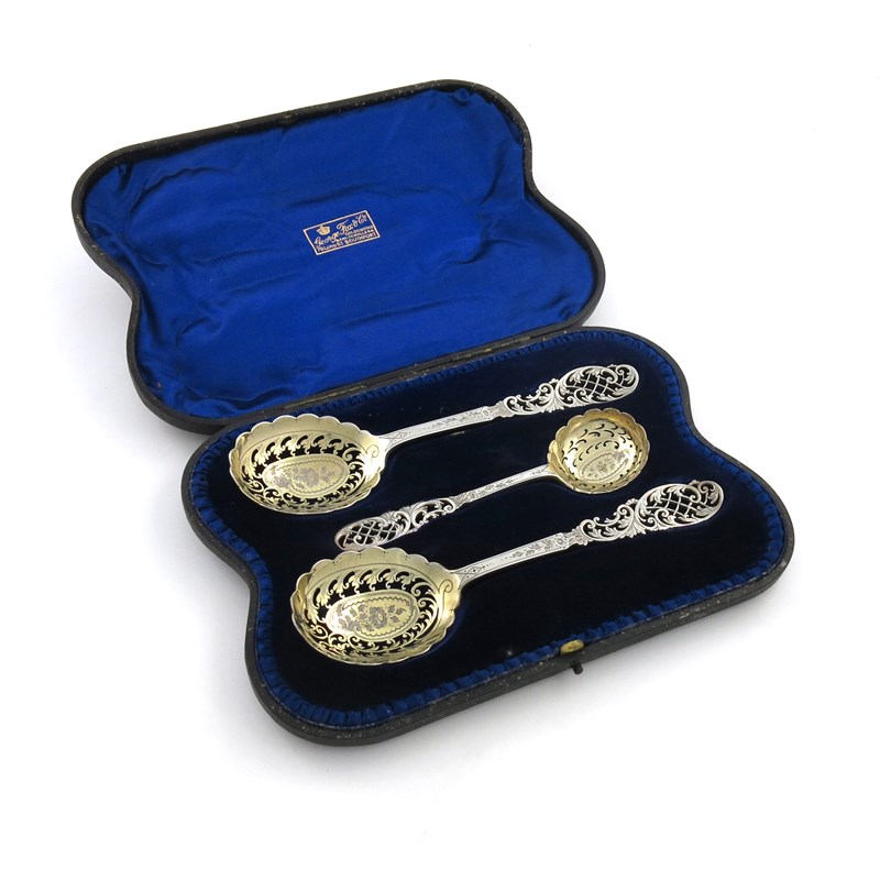A pair of Edwardian parcel-gilt fruit serving spoons and a sifting spoon