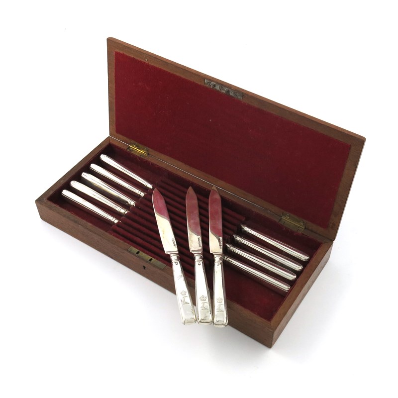 tapering reeded rectangular handles, crested, in a fitted wooden case. (12)