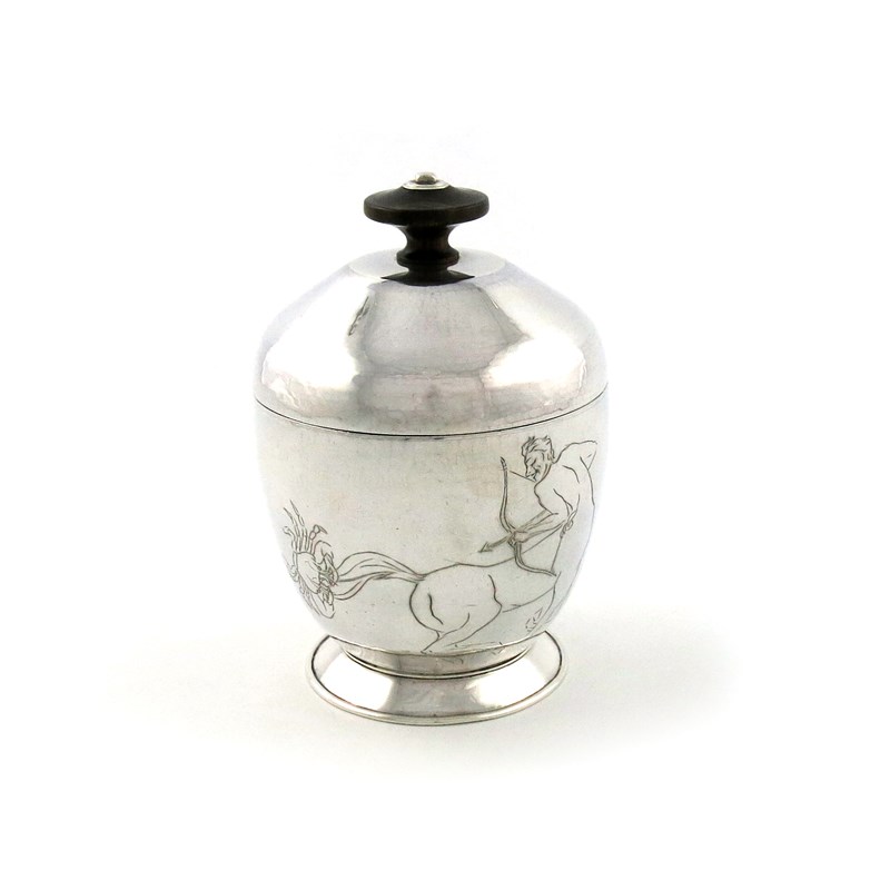 tapering circular form, engraved with a crab (Cancer) nipping the tail of Sagittarius, who is about to fire his arrow at the crab, the tapering pull-off cover with a later wooden finial, on a raised circular foot, height 18.5cm, approx. weight 12oz.