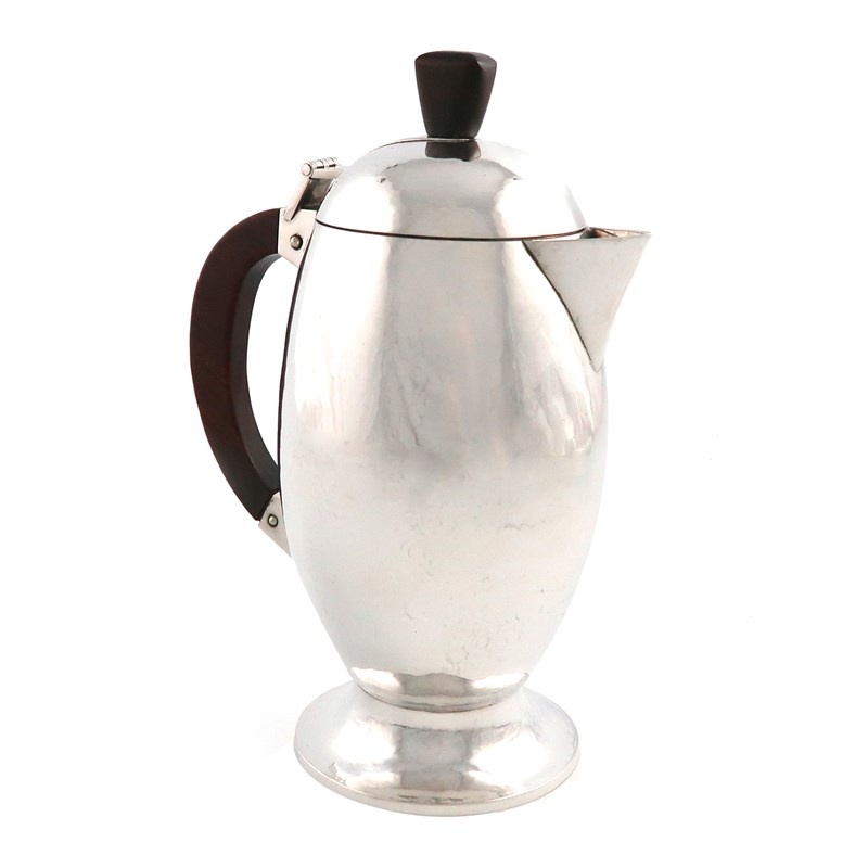 ovoid form, spot-hammered decoration, wooden scroll handle and finial, domed hinged cover, on a raised circular foot, height 24cm, approx. weight 19oz.