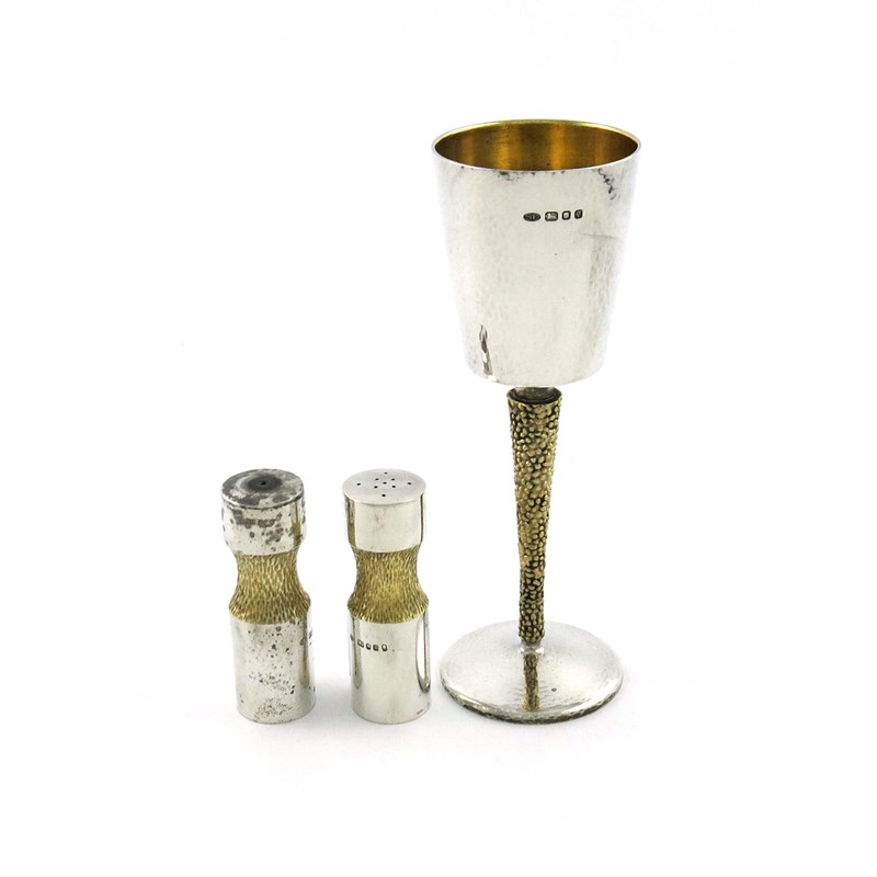 tapering circular spot-hammered bowl, on a tapering textured silver-gilt stem, on a circular foot, height 18.5cm, plus a pair of parcel-gilt silver salt and pepper pots, by Devlin, London 1977, approx. total weight 11oz. (3)