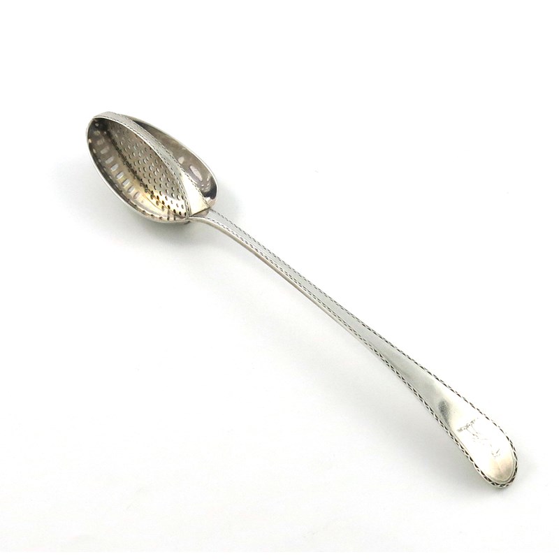 the bowl with a pierced straining section, the terminal with a crest, length 29cm, approx. weight 4oz.