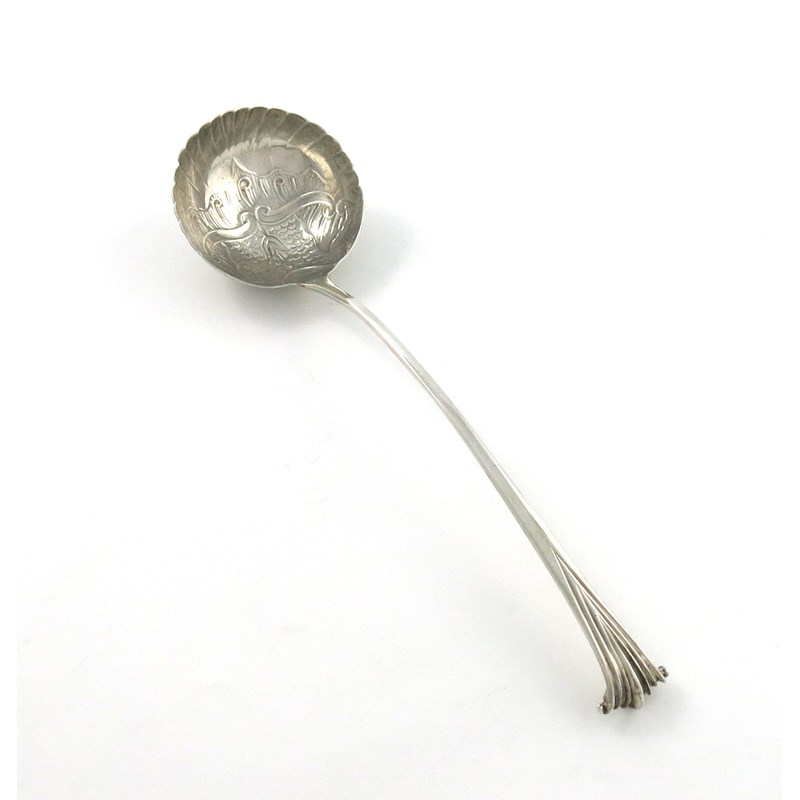 the circular bowl with chased foliate and fish-scale decoration, length 27.8cm, approx. weight 3.5oz.