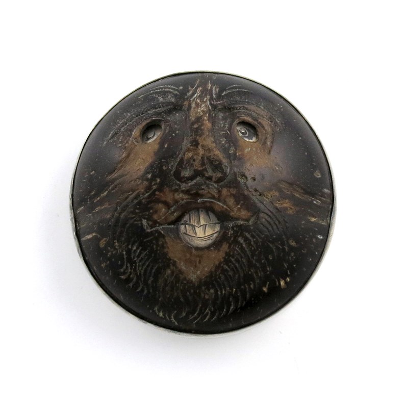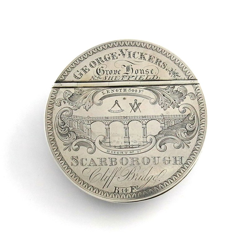 circular form, the hinged cover engraved with a scene of the Scarborough Cliff Bridge with a beach scene behind with ships, and inscribed 'GEORGE VICKERS Grove House Nr. SHEFFIELD LENGTH 344FT. HEIGHT 67FT. SCARBOROUGH CLIFF BRIDGE. B. 14ft', also engraved with a square and compass and a pair of compasses, possibly for a Masonic connection, the underside of the box formed by a carved coconut shell with a face with engraved teeth, diameter 7.8cm.