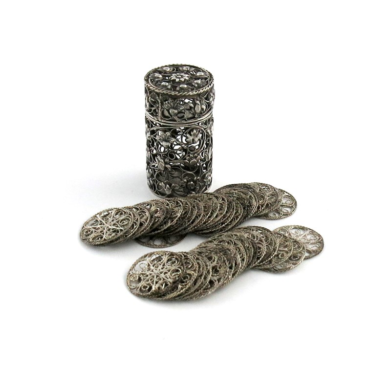 cylindrical form, with foliate and scroll filigree decoration, pull-off cover, the interior with forty-four filigree counters, height 4.5cm, approx. weight 1.3oz. (45)