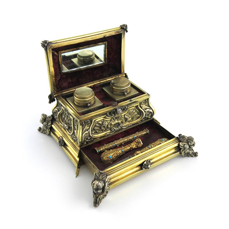 rectangular form, on four cast and applied putto mask and foliate scroll feet, and with hinged domed cover with shell motifs, chased overall with shells and scrolls on a matted ground, the base applied with four with rosettes and with drawer lined with velvet and fitted with a combination propelling pencil and pen, a desk seal with blood stone matrix and a small knife with steel blade, the mounts each chased with flowers on a matted ground and inset with turquoise, the interior of the casket fitted with two engine-turned square inkwells with hinged covers, the interior of the cover with a mirror, length 17cm, approx. weight 34oz.