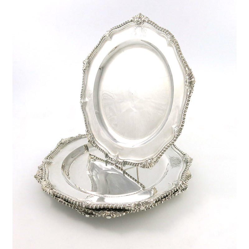 by Perter Archambo and Peter Meure, London 1753,shaped circular form, gadroon and shell borders, engraved with an armorial, the undersides with a scratch number and weight 'N0.3, 34=13', 'No.6 36=2', No.7 34=19', and 'No.8 36=2', diameter 32cm, approx. weight 139.5oz. (4)