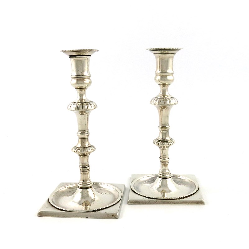 fluted knopped stems, spool shaped capitals, removable drip pans, on square bases, engraved with initials and a crest, height 21.5cm, approx. weight 34.5oz. (2)