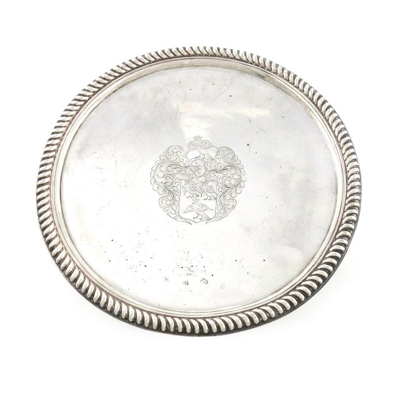 circular form, rope-work border, the centre engraved with the arms of Dr. Richard Baylie, within foliate mantling, on a raised circular part-marked foot with a matching border, the underside inscribed 'This for Richard Dighton of Clifford Christned (sic) y 6th of March 1664 From his Grand Father Dr. Richard Baylie, Dean of Sarum', diameter 26.8cm, height 8cm, approx. weight 19.5oz.
