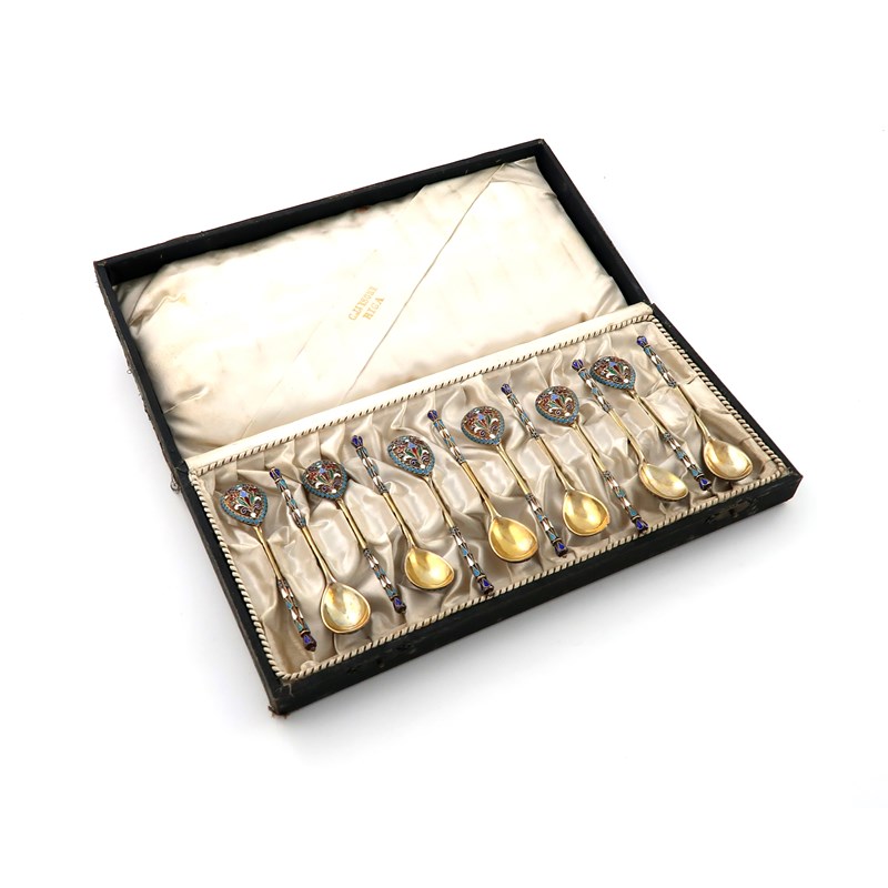 A set of twelve late-19th century Russian silver-gilt and enamel teaspoons