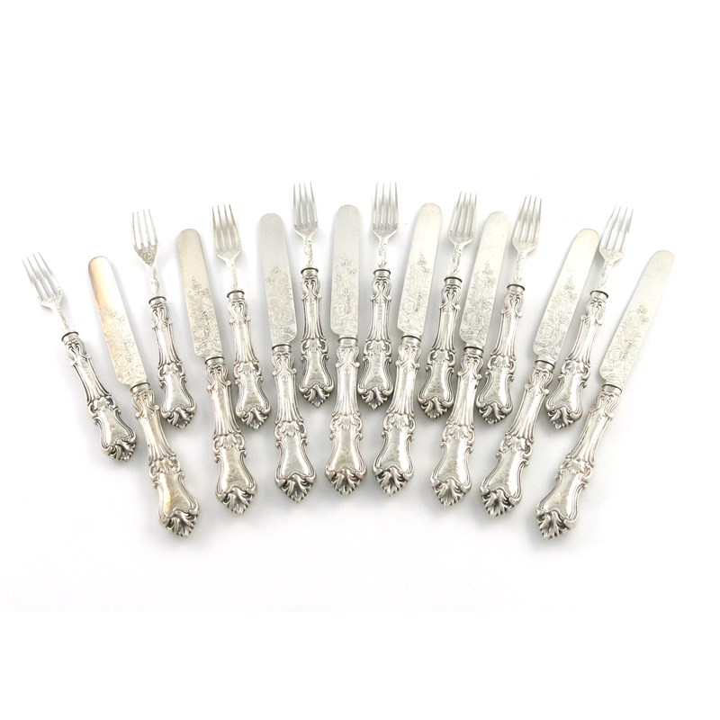 the blades with engraved foliate decoration, the handles with a crest. (16)
