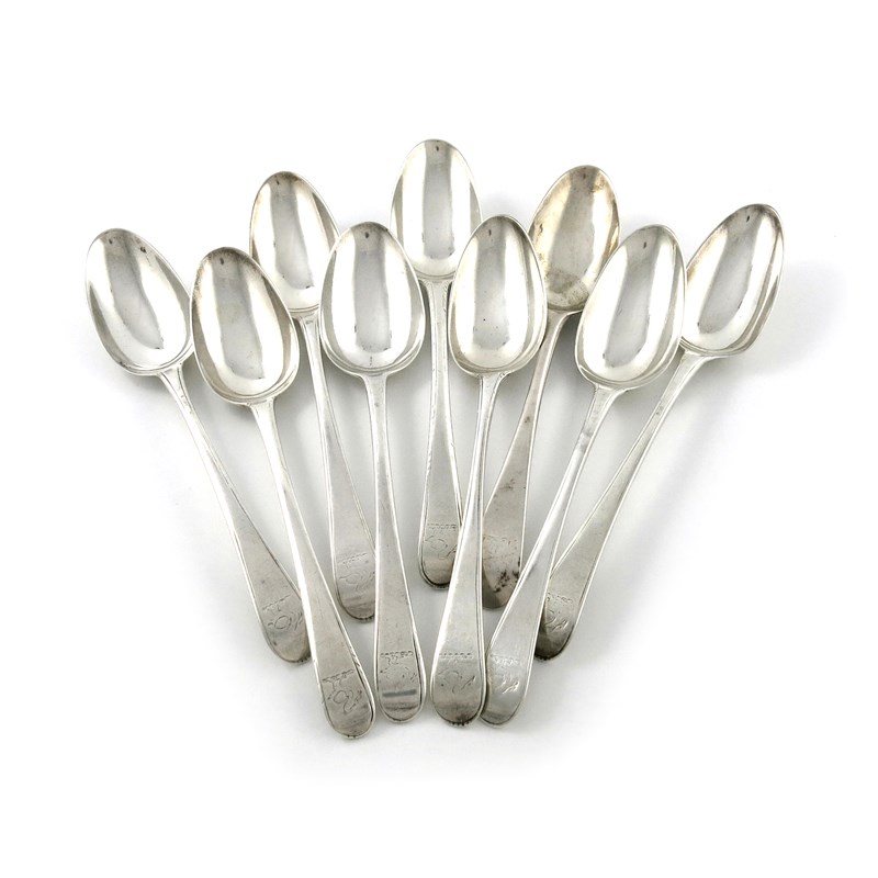 A collection of nine George III silver Feather-edge pattern tablespoons