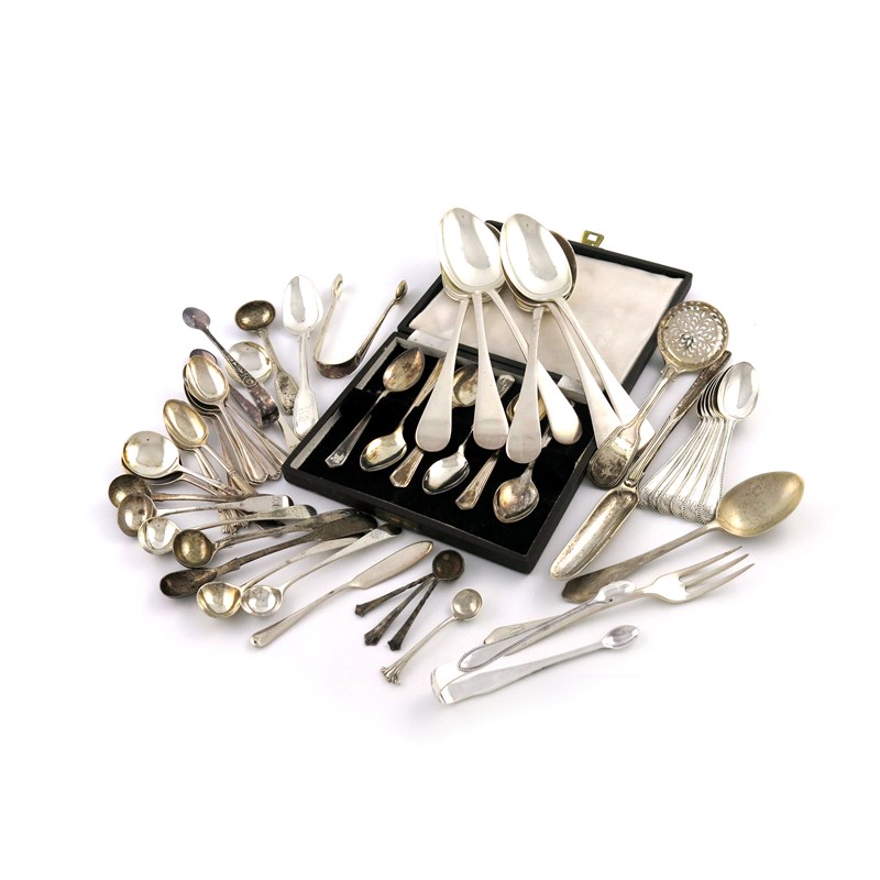 comprising: a Fiddle and Thread marrow scoop, by Mary Chawner, London 1836, a set of six Old English pattern tablespoons, by J. Rodgers, Sheffield 1913, a sugar sifting spoon, six beaded teaspoons and tongs, a fork and spoon, three jam spoons, twelve condiment spoons, plus other items including a cased set of six teaspoons, approx. weighable 35oz. (qty)