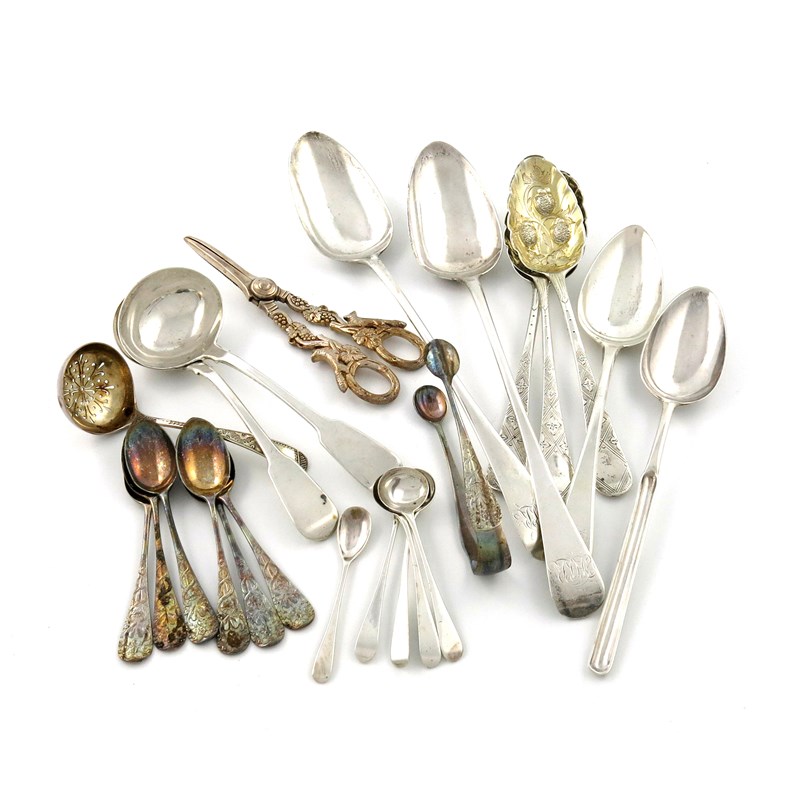 comprising: a pair of George III Old English pattern basting spoons, by Crossley and Smith, London 1810, the terminals initialled, a George III marrow spoon, London 1761, the heel scratch initialled 'I.P', a pair of grape scissors with foxes and grape decoration, Sheffield 1964, a pair of Fiddle pattern sauce ladles, a sifting spoon, four tablespoons, five condiment spoons and a cased set of six teaspoons and tongs, approx. weight 30oz. (qty)