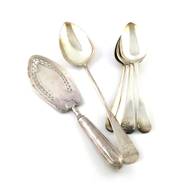 comprising: a fish slice, by Thomas Price, London 1800, pierced blade, reeded handle, a basting spoon, by Thomas Dicks, London 1803, and a set of four tablespoons, London 1814/15, approx. weighable 12.9oz. (6)