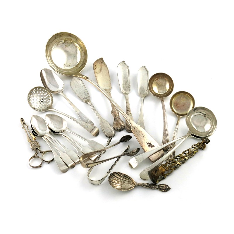 comprising: a William IV Scottish silver Fiddle pattern soup ladle, by Robert Gray, Glasgow 1834, the terminal initialled, plus a pair of George III Old English pattern sauce ladles, by Peter and Ann Bateman, London 1792, plus a Feather-edge sauce ladle, London 1802, a sifting spoon, a pair of 18th century sugar nips, three pairs of sugar tongs, a set of six Fiddle pattern teaspoons, by G. Turner, Exeter 1826, a ladle, a tablespoon, a caddy spoon, and four butter knives, approx. weight 30oz. (qty)