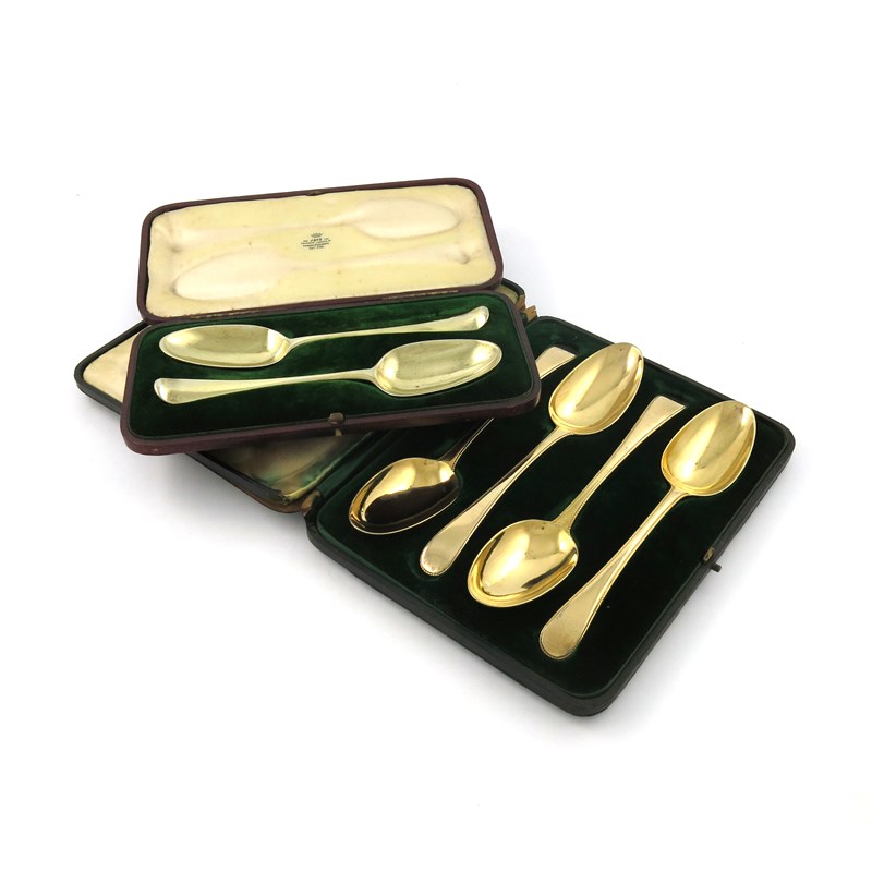 later gilded, in a fitted case, retailed by Garrards, plus a cased pair of George II silver-gilt tablespoons, by Ebenezer Coker, London 1751/52, approx. total weight 12.9oz. (6)
