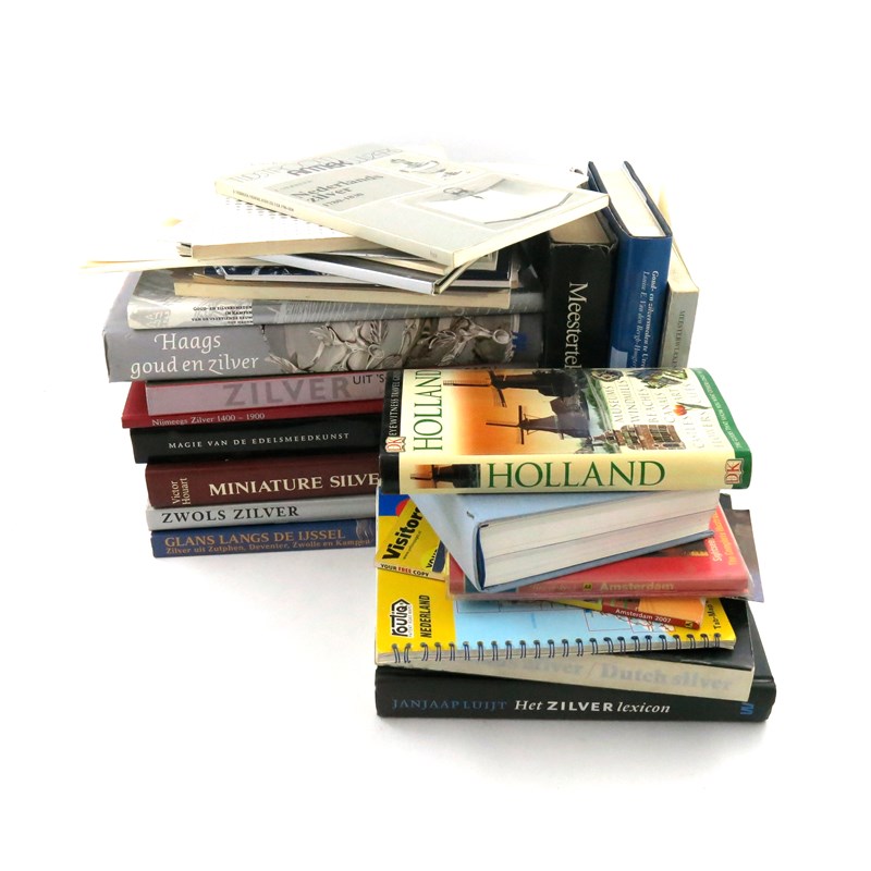 including: Maker's Marks of Dutch Gokld and Silversmiths 1814-1963, Zwols Zilver, Zilver Lexicon, Haags Goud en Zilver, Minaitre Silver Toys, Zilver uit Zutphen, Deventer, Zwolle en Kampen, Goud-en Zilversmeden te Utrecht in de late Middeleeuwen, Amsterdams Zilver 1520-1820, and other volumes. (qty)