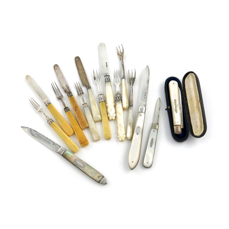 comprising: a large folding fruit knife, by C W Fletcher & Son Ltd., Sheffield 1928, a cased fruit knife, a Georgian one with engraved decoration, and one other, plus two christening forks and spoons with mother-of-pearl handles, two further forks and three ivory-handled forks and two knives. (qty)