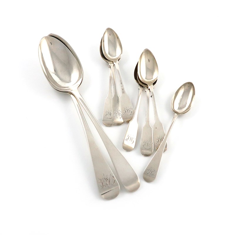 comprising: a set of six George IV Fiddle pattern teaspoons, by Barber, Cattle and North, York 1829, the terminals initialled, plus two Old English pattern tablespoons, and a teaspoon, approx. weight 8oz. (9)