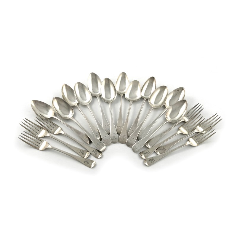 comprising: a matched set of six dessert forks, by John Meek, London 1826, the terminals with a crest, plus one other, and a set of five dessert spoons, by William Chawner, London 1817 the terminals crested, and seven further dessert spoons, various makers, all with same crest, approx. weight 20oz. (18)