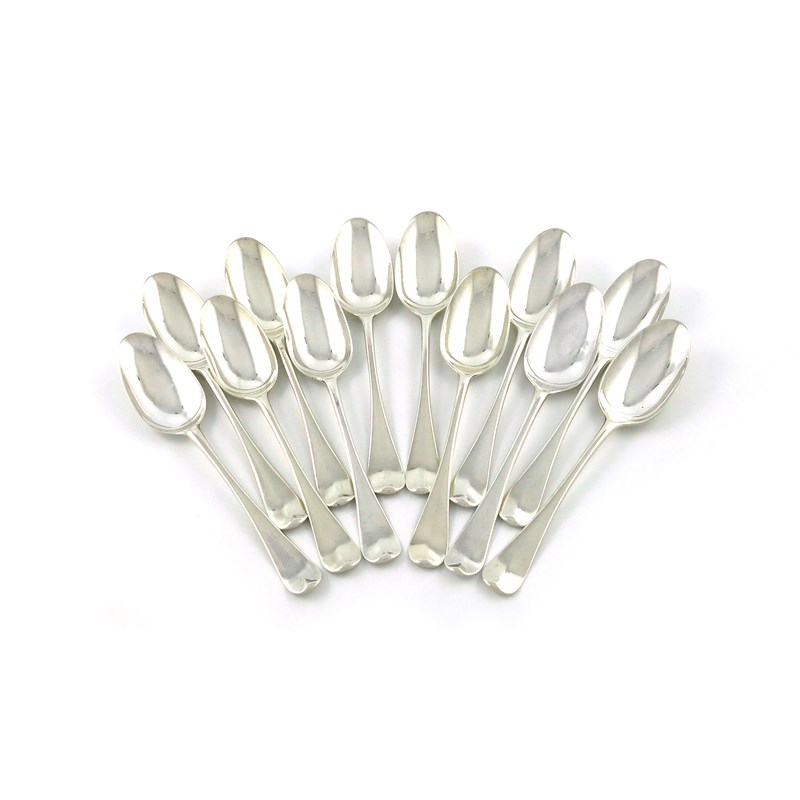 A matched set of twelve George II silver Hanoverian pattern dessert spoons