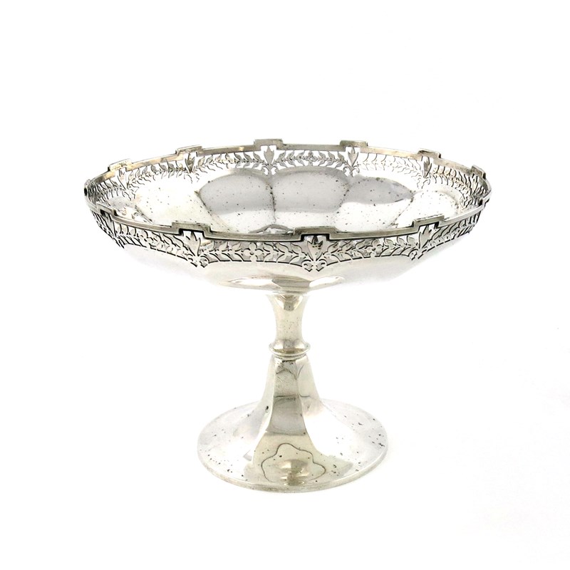 circular form, pierced foliate border, on a raised panelled circular foot, height 17.3cm, approx. weight 21oz.